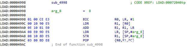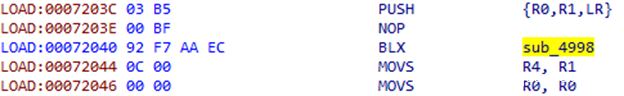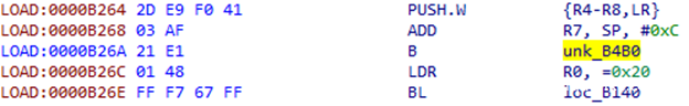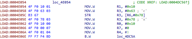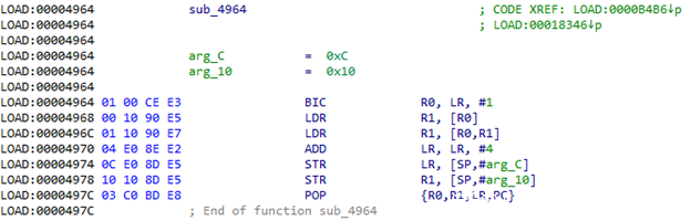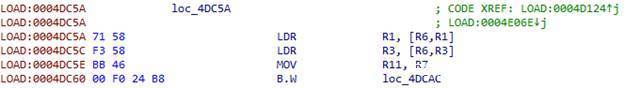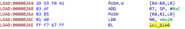 ARM架构使用R0–R3寄存器来存放前4个函数参数,如果还有其他参数,则通过栈来保存。LR寄存器用来保存返回地址。我们需要保存这些数据,这样当我们dump参数后,函数还能正常工作。我们还需要保存过程中使用的所有寄存器的值,因此我们使用的是PUSH.W {R0-R10,LR}指令。在R7寄存器中,我们可以得到通过栈传递给函数的参数列表地址。