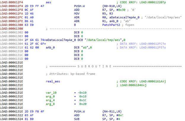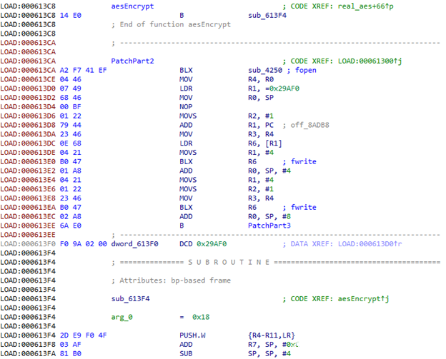 使用fopen函数,以ab模式打开/data/local/tmp/aes文件(这样我们就能追加写入)。然后加载R0寄存器中的文件名地址以及R1寄存器中的字符串地址(该字符串用来表示文件打开模式)。随后就是垃圾代码结束的位置,因此我们继续转到下一个函数。由于我们希望程序能继续运行,因此我们在函数开头处、垃圾代码之前转移到实际函数代码,然后将垃圾代码替换为剩余的patch代码。