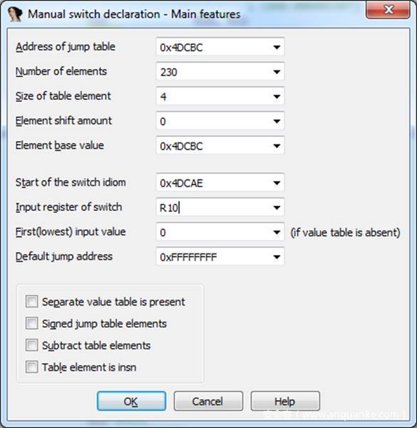 如何处理这张表?我们需要告诉IDA这是一种switch跳转:选择“Edit -> Other -> Specify switch idiom”。