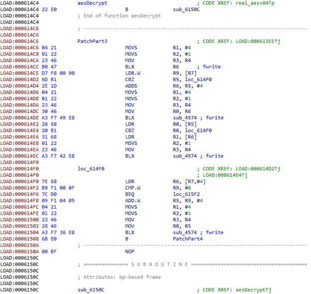 知道算法后,我们只需要获得参数即可,比如加密模式、秘钥以及初始向量(IV,是否存在该向量取决于AES算法的操作模式)。在调用sub_6115C函数之前,代码必须在某个地方先创建包含这些参数的结构体。但由于这部分代码经过混淆处理,我们决定patch代码,将解密函数用到的所有参数都dump到文件中。