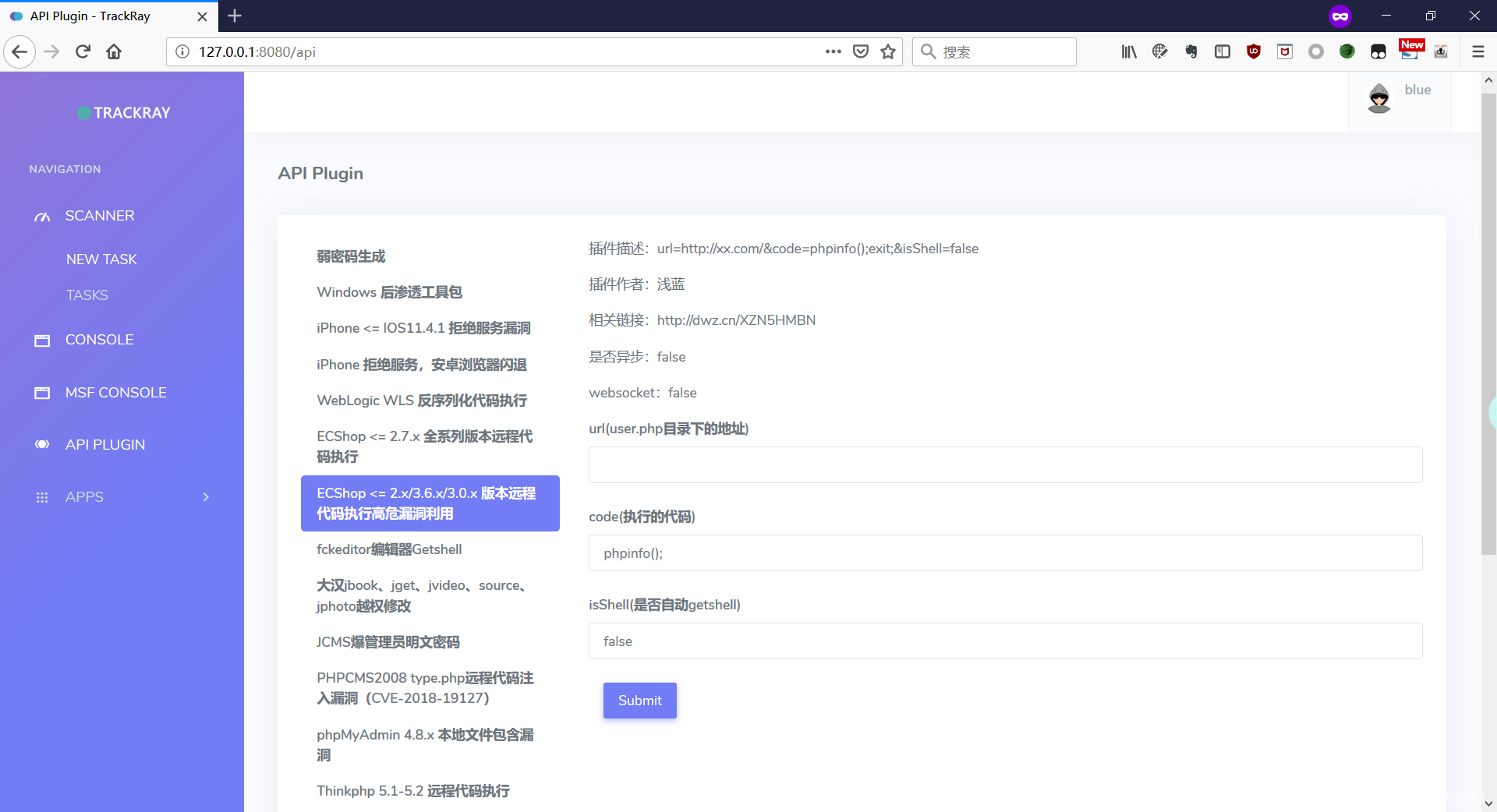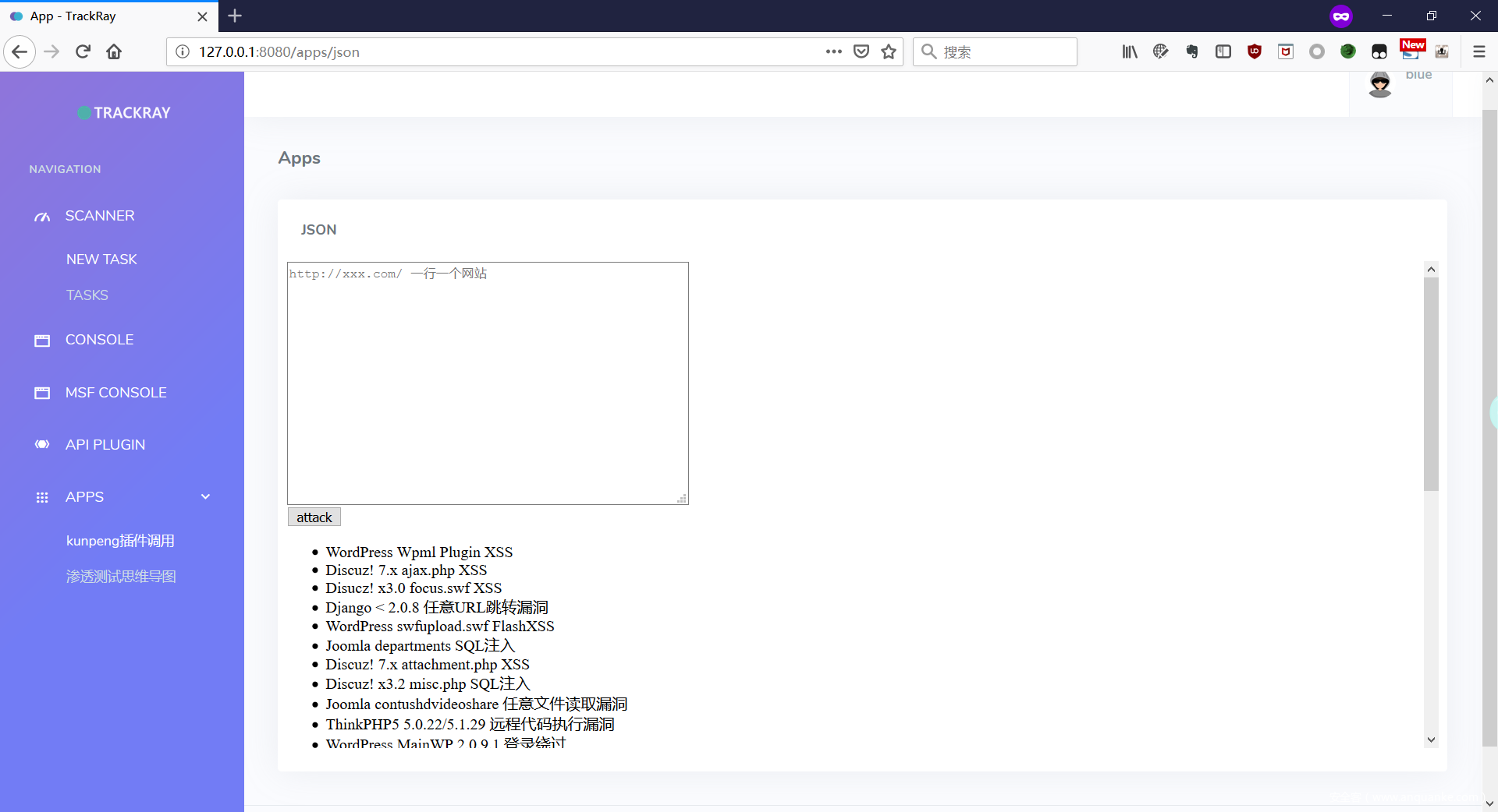 在扫描任务勾选“漏洞攻击模块”时会被调用,或通过 MVC 插件调用 http://127.0.0.1:8080/apps/json。