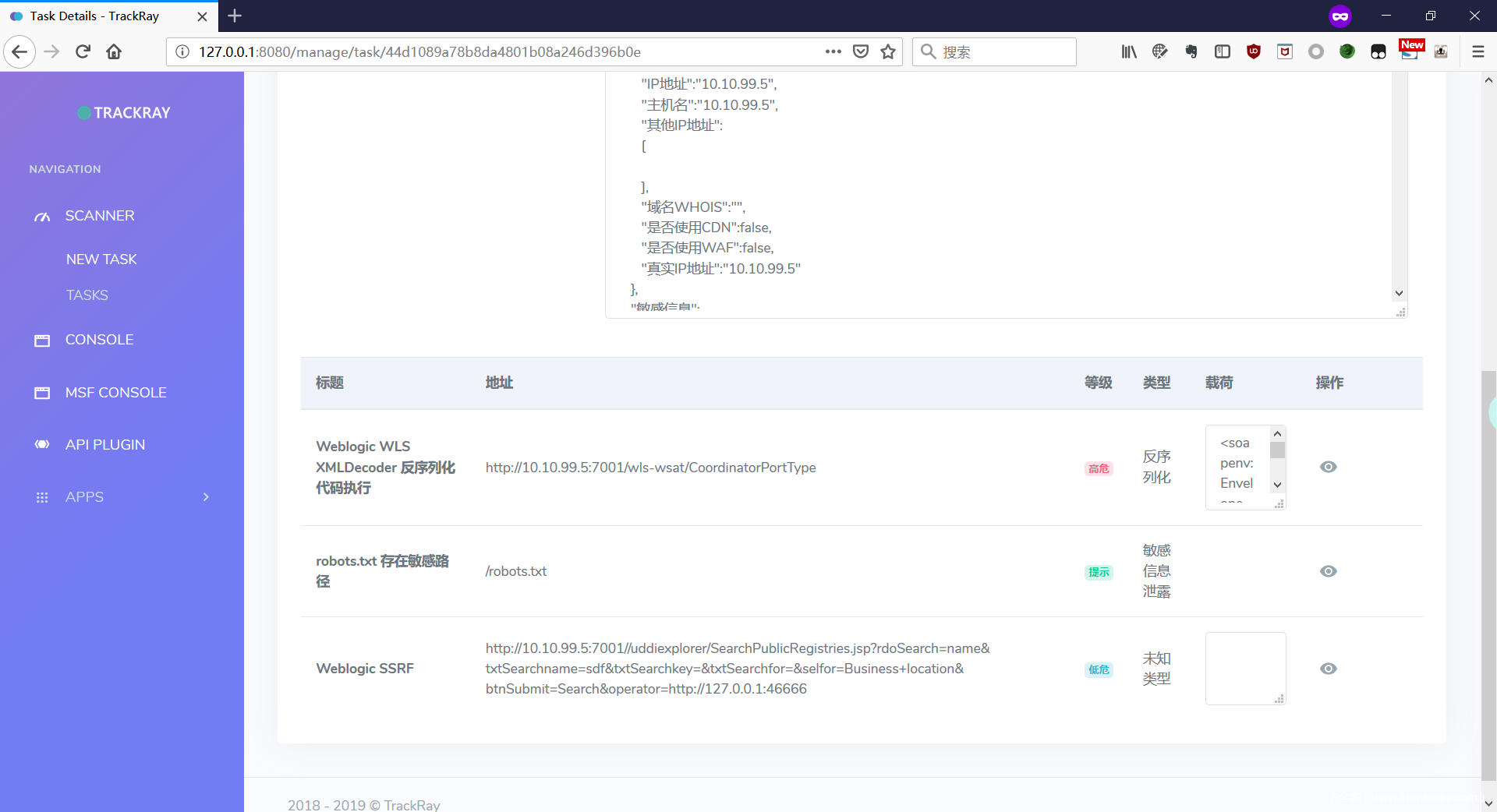 task 属性为当前任务对象,如果你的爬虫插件不是检测漏洞而希望是检测一些敏感信息的话可以修改 task.getResult() 里的属性。