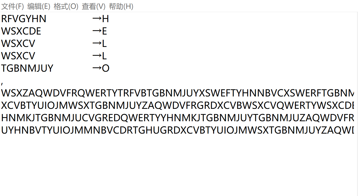 仔细看一下文件开头的字母,结合提示,发现就是一个简单的键盘加密(画键盘),而且似乎每一个字母的加密方式都一样,用文本的替换功能即可获取原文。