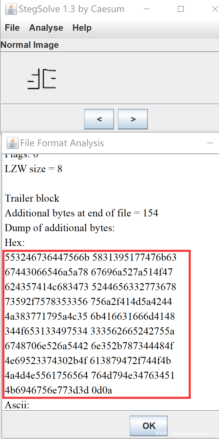 再用stegsolve的 “File Format” 查看图片信息的时候发现其所转换的ascii码的内容是密文,