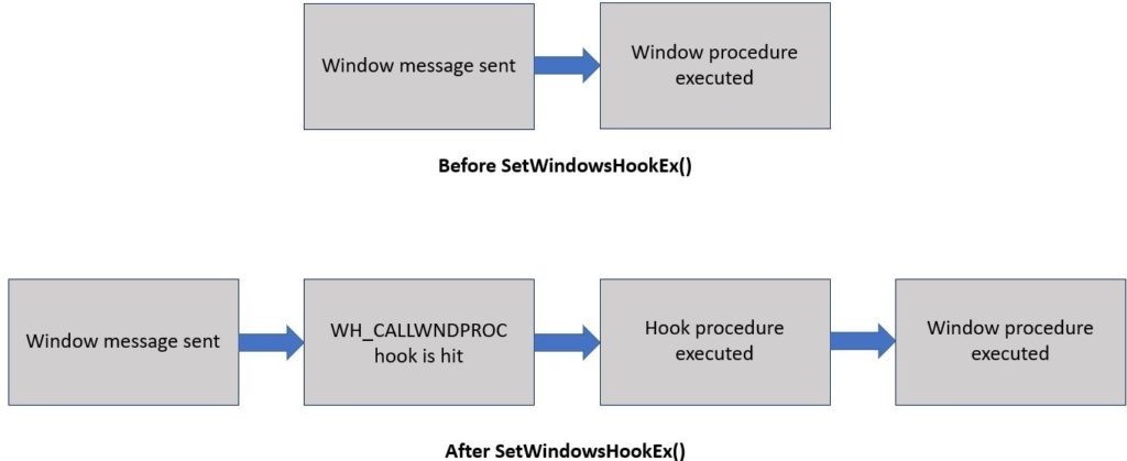 下图显示的是设置WH_CALLWNDPROC钩子之前和之后的Windows消息调用流程: