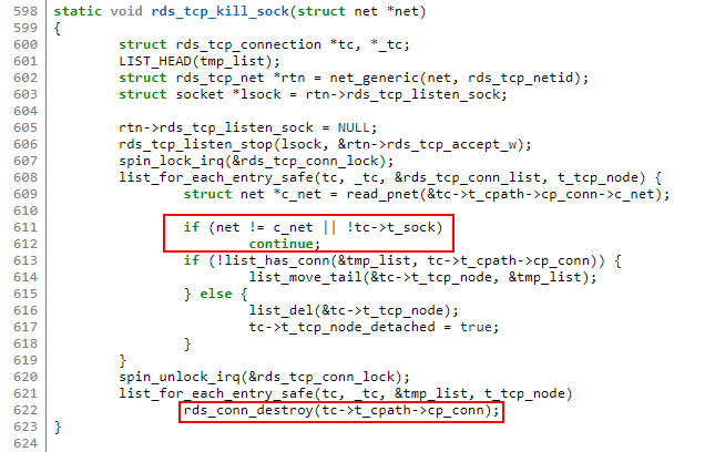 内核会检查每个连接,判断在用的TCP套接字对应的t_sock指针是否为NULL,如果满足条件,就不会将t_tcp_node添加到“清理列表”中。这样处理的结果就是,内核不会针对这些节点调用rds_conn_destroy(),也不会执行许多“清理”操作。