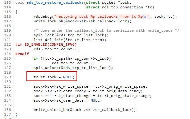 图3. 在rds_tcp_restore_callbacks()中将t_sock设置为NULL