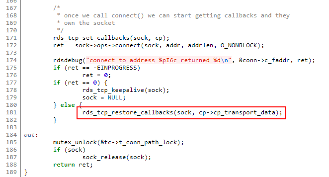 当客户端的底层TCP套接字持续无法连接时,就会出现与RDS有关的问题。当TCP的connect()失败时,系统就会调用rds_tcp_restore_callbacks()函数,将rds_tcp_connection结构中的t_sock指针设置为NULL,这是非常合理的行为。