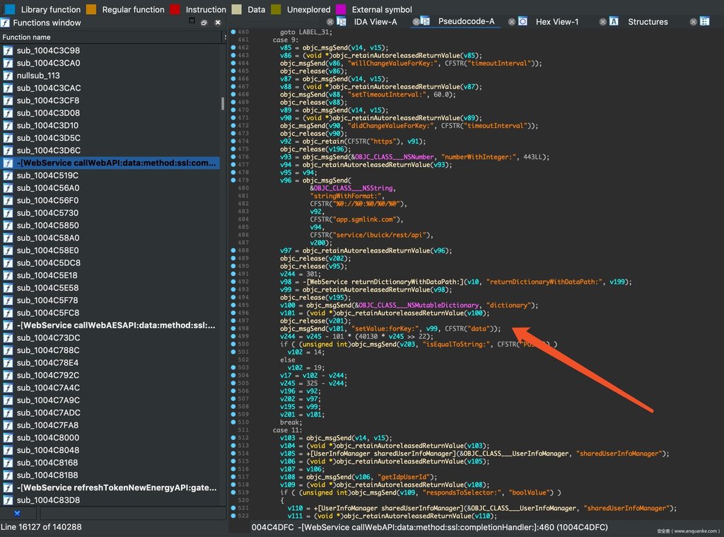浏览该类发现可以看到data等关键加密信息,接着我们尝试搜索data前面的setValue:forKey