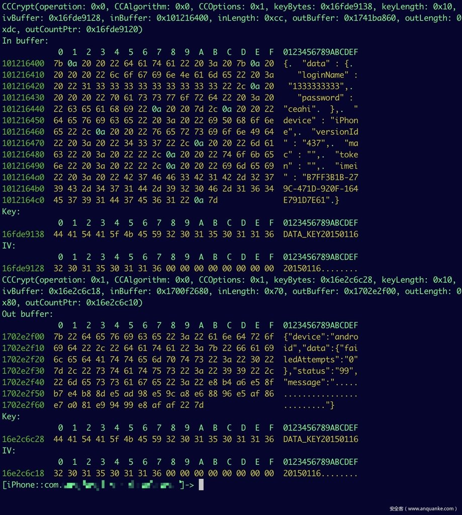 operation: 0x0代表加密,0x1代表解密,CCAlgorithm: 0x0指加密方式是kCCAlgorithmAES128,CCOptions: 0x1指模式是cbc,key=DATA_KEY20150116和iv=20150116