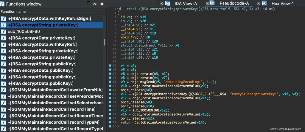 ios hooking watch method “+[RSA encryptString:privateKey:]” –dump-return