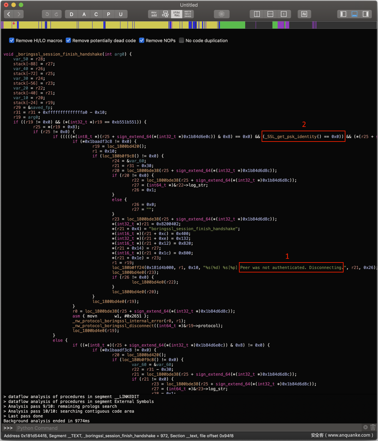 将libboringssl.dylib载入Hopper后,我找到了“Peer was not authenticated”错误(如下图红框1处),该错误位于boringssl_session_finish_handshake()函数中: