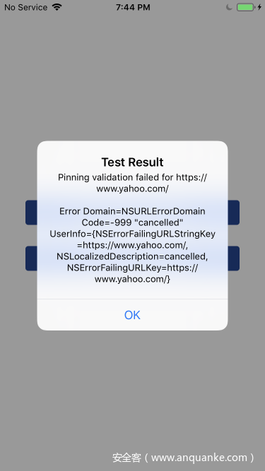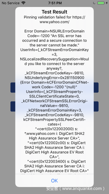 我也专门设计了测试应用代码,使其自定义/pinning验证逻辑始终会返回失败:
