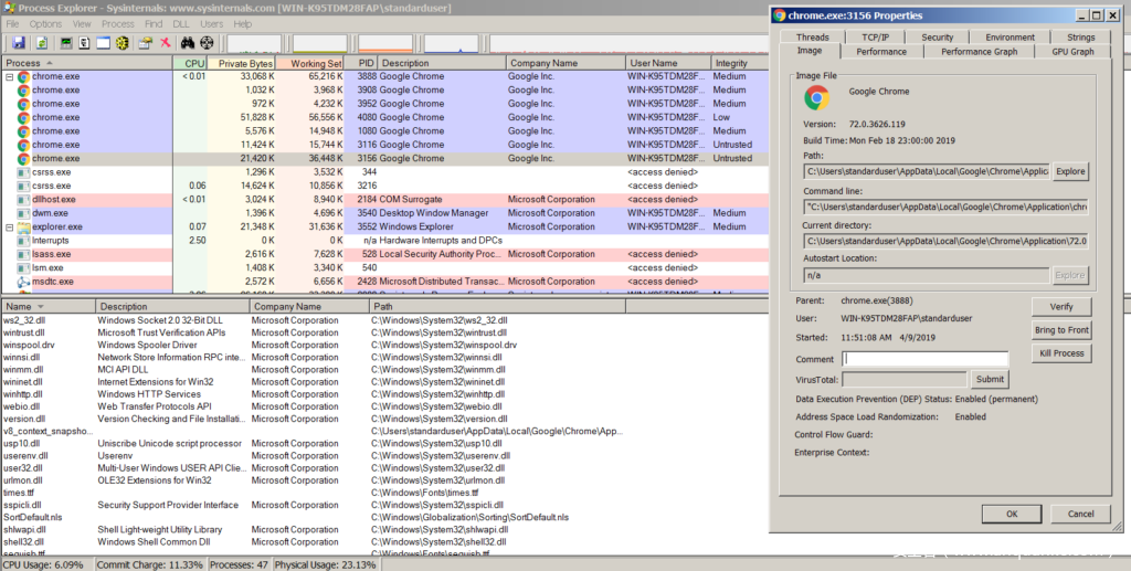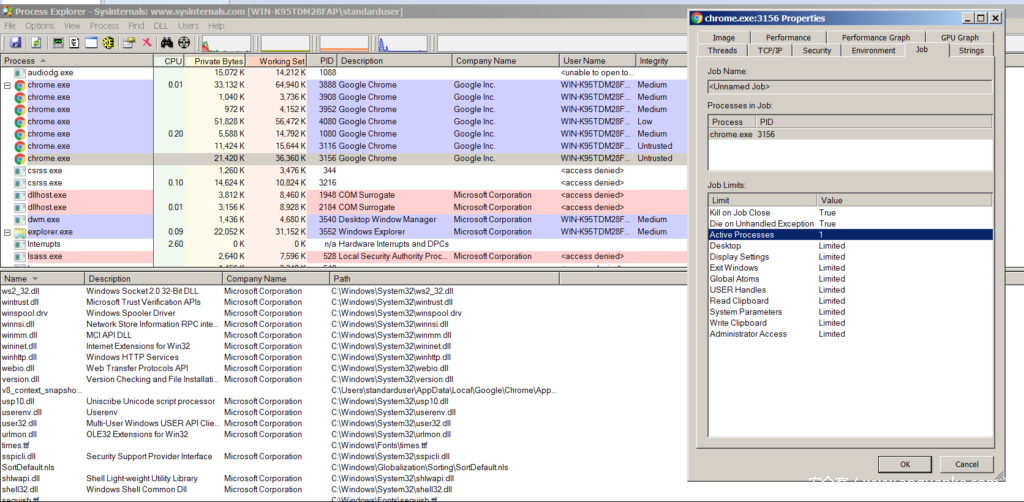 再次检查Process Explorer,我们可以确认,由于Chrome渲染的进程令牌中的“作业”字段已为NULL,因此不再有与Chrome渲染器进程关联的任何作业。我们可以在下面的屏幕截图中看到,Chrome渲染器进程无法再使用“作业”选项卡,因为不再有任何作业与之关联,也就意味着它现在可以生成任何想要的子进程。
