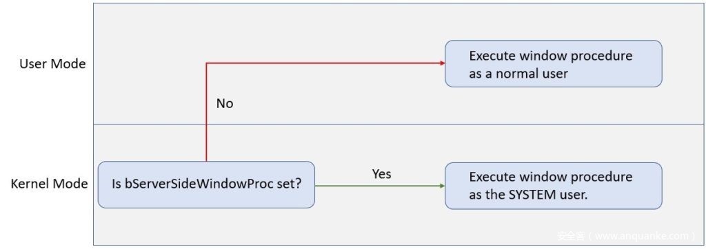 由于已经在secondaryWindow的tagWND对象中设置了bServerSideWindowProc标志,因此现在应该以SYSTEM用户身份运行sprayCallback()。sprayCallback()函数首先检查传入消息是否为WM_ENTERIDLE消息。如果是,那么内联Shellcode将确保sparyCallback()确实作为SYSTEM用户运行。如果该检查通过,那么布尔型变量将成功设置为TRUE,以指示攻击成功,随后执行函数Shellcode()。