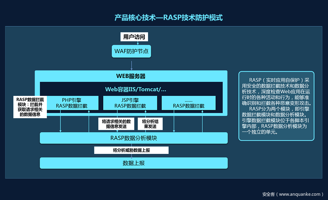 当然这类产品优点虽然很明显,但缺点也很突出,就是侵入性太强。对于业务连续性要求很高的行业,一般不敢轻易尝试。从我们实际部署的经验看,可以考虑从一些边缘的系统开始测试,稳定后逐步覆盖到关键系统。在部署安装的时候可利用多节点负载备份和选择非工作时段,同时要求RASP安全策略和自身模块支持热更新模式,无需重启服务。