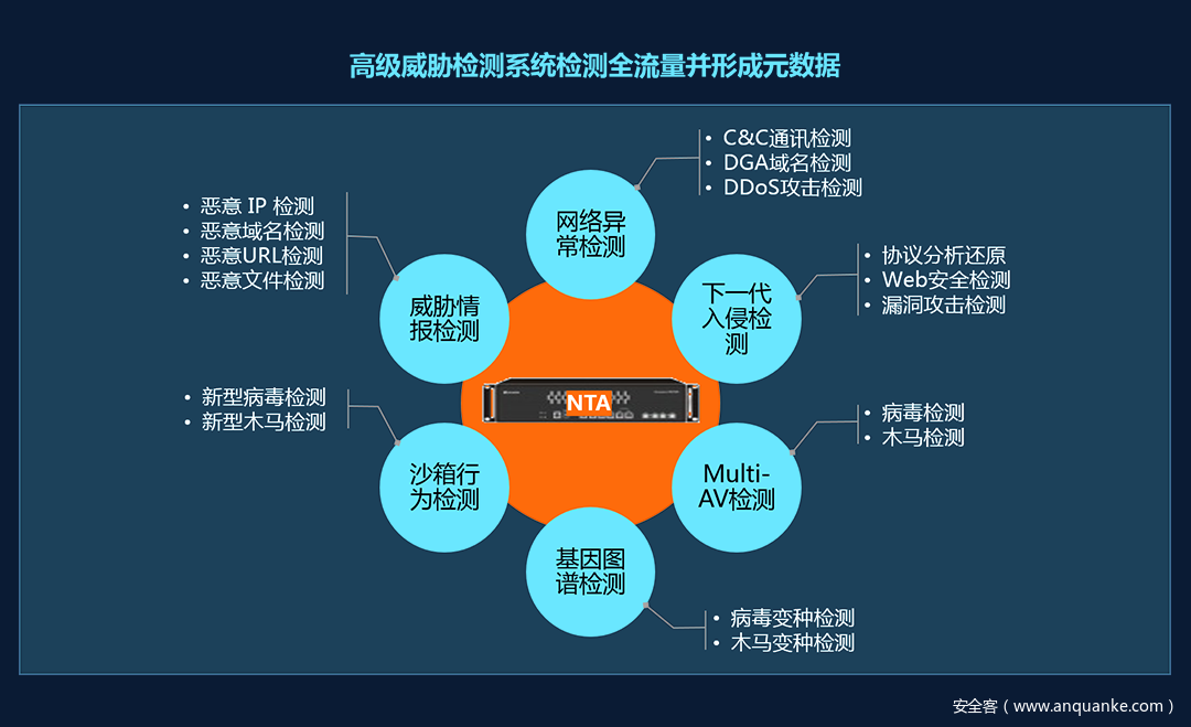 这个阶段对于数据外传的检测是相当重要的,这里重点推荐流量威胁检测类型的产品。不少人认为流量威胁检测产品是IDS的下一代升级版,这样认为有一定道理(都是旁路流量检测)但又不完全准确,笔者认为好的流量威胁检测产品须具备以下特性: