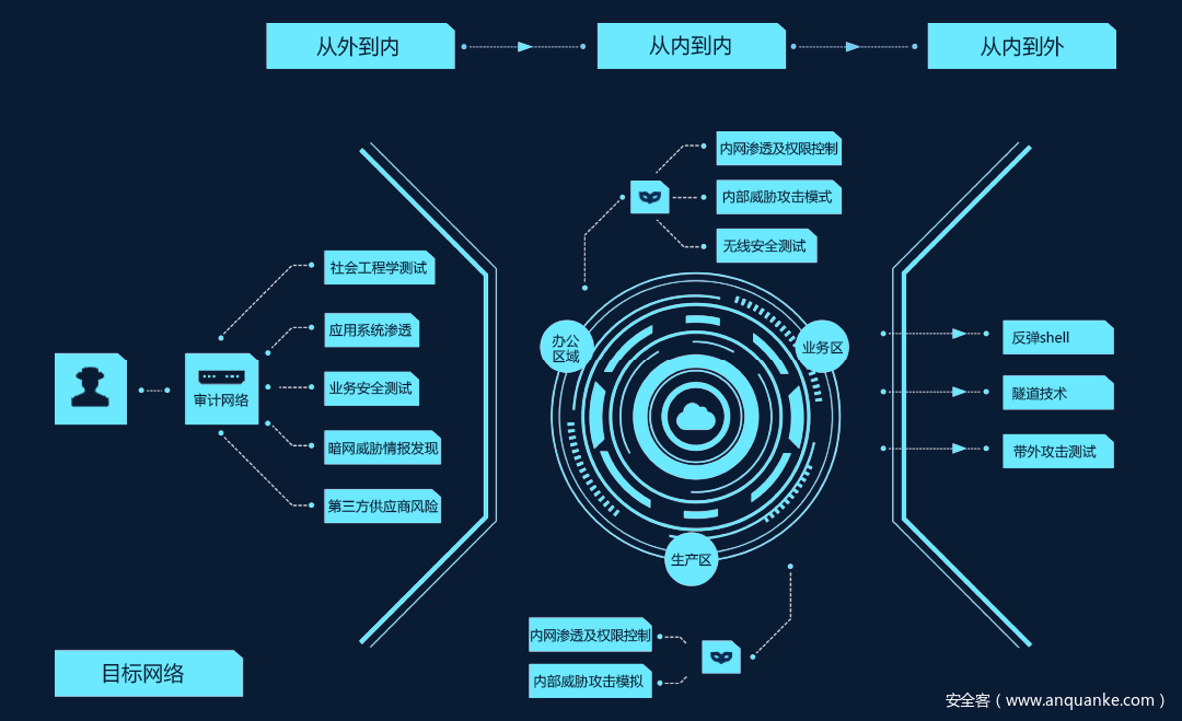 - “从内到外”主要检验企业对于安全威胁感知能力和信息数据外传泄露的检测能力等;这部分的攻击方法会涉及隐藏的反弹Shell(绕过防火墙)、隐蔽隧道数据传输等。