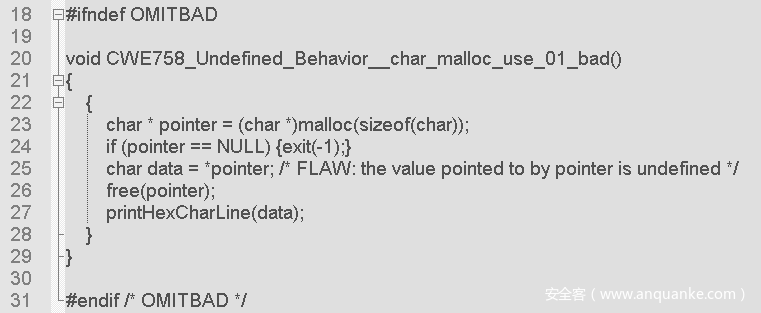 示例源于Samate Juliet Test Suite for C/C++ v1.3 (https://samate.nist.gov/SARD/testsuite.php),源文件名:CWE758_Undefined_Behavior__char_malloc_use_01.c。