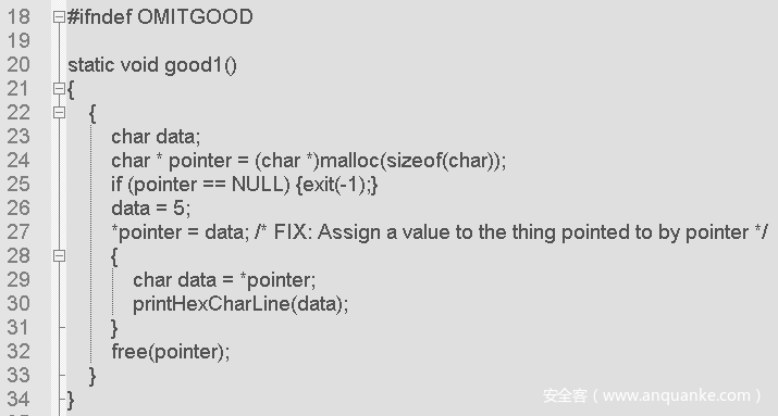 在上述修复代码中,Samate给出的修复方式为:在第27行对指针 pointer 进行赋值,从而避免了未初始化值用于赋值操作。