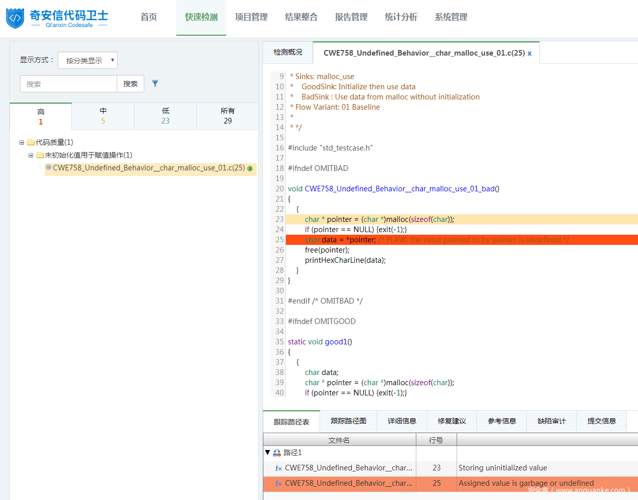 使用代码卫士对上述示例代码进行检测,可以检出“未初始化值用于赋值操作”缺陷,显示等级为高。如图1所示: