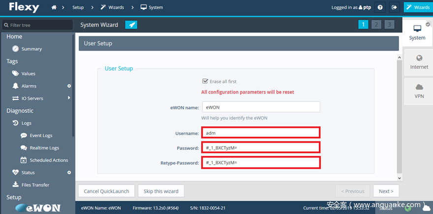 现在让我们回到默认凭据上,Ewon默认凭据其实可以算是公开的秘密,这在初次安装设备时没有问题。当我们使用设置向导时,系统会预先给我们设置用户名和密码,具体值大家可以猜到:adm:adm。