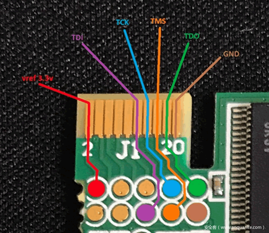当看到2×5的圆形测垫时,我立刻想到了“JTAG”。实话实说,初始测试及开发主板时使用该工具也非常正常。大家可以看到左上角有个2-20插槽连接器,我猜测这个连接器可以用来快速连接到JTAG编程器,烧录设备。