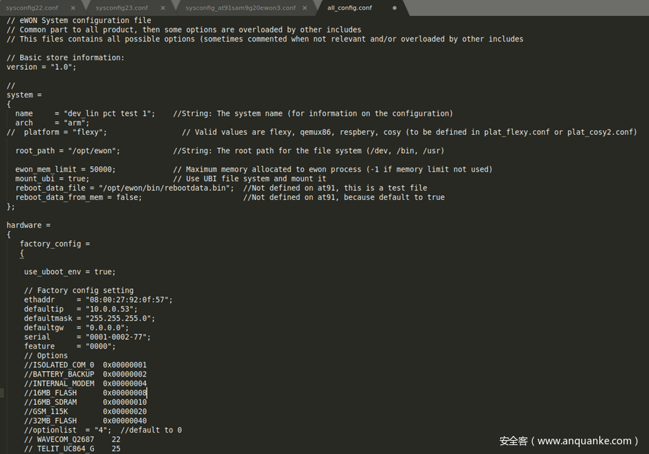 现在事情变得有趣起来。我们已经拿到二进制文件、一些配置脚本以及一些bash脚本,还有一些貌似是Java程序以及jar文件。我们首先来看一下配置文件,最后再分析Ewon二进制文件。