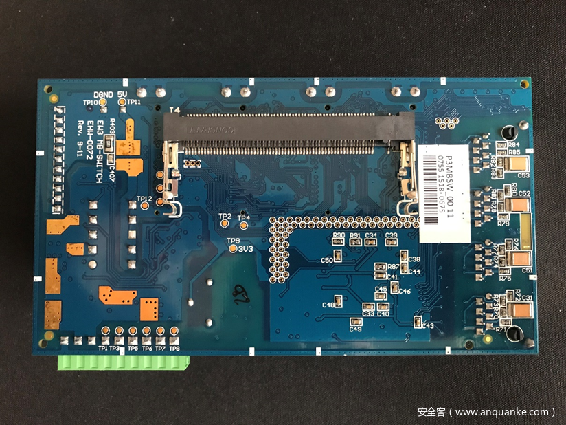 比较有意思的是OS板上的NAND Flash、OS板左上角的测垫(2×5的圆形焊点)以及主板背板上靠近盒式插槽的3个测垫(靠近TP12)。