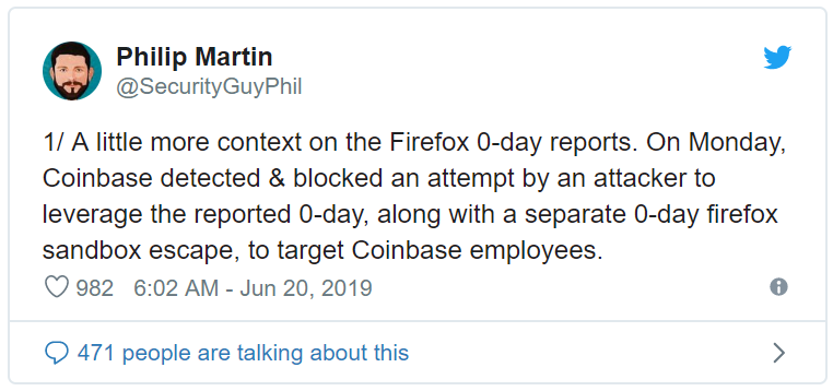 最近有攻击者利用Firefox 0day漏洞来攻击各种加密货币交易所的员工,我自己也收到了某位受害者的邮件,其中提供了攻击细节以及攻击者在目标系统中安装的恶意软件。