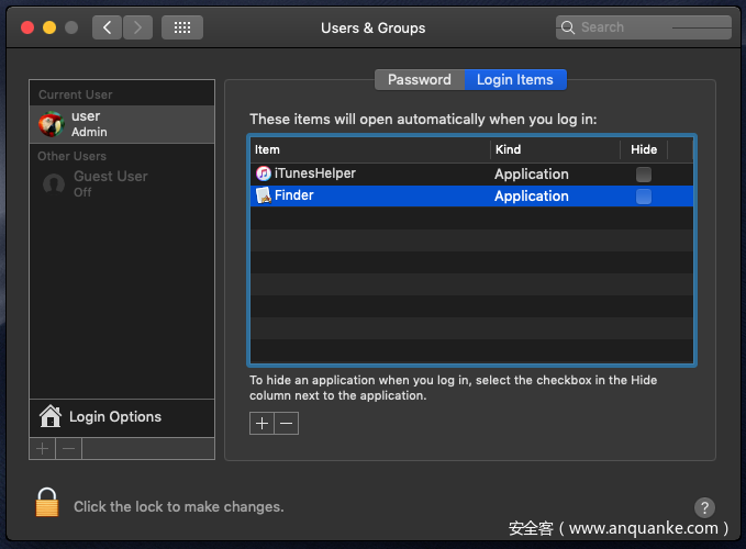 恶意软件还通过登录项确保每次用户登录时都能启动恶意软件,然而登录项会在UI中显示,因此会暴露恶意软件的行踪: