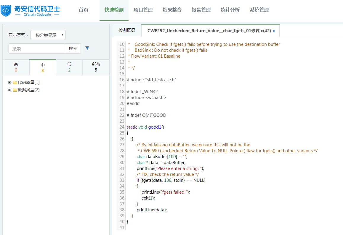 在上述修复代码中,Samate给出的修复方式为: 在第33行对 fgets() 函数的返回值是否为NULL 进行了判断,当返回值为 NULL 时程序终止,从而避免了“忽略返回值”问题。