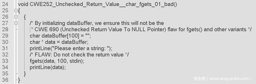 示例源于SamateJuliet Test Suite for C/C++ v1.3 (https://samate.nist.gov/SARD/testsuite.php),源文件名:CWE252_Unchecked_Return_Value__char_fgets_01.c。