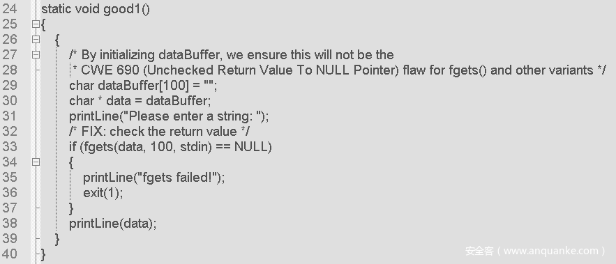 如果函数执行成功,则返回第一个参数 buf;如果发生错误,则返回 NULL,如果没有对函数返回值进行检测,那么当读取发生错误时,则可能因为忽略异常和错误情况导致允许攻击者引入意料之外的行为。