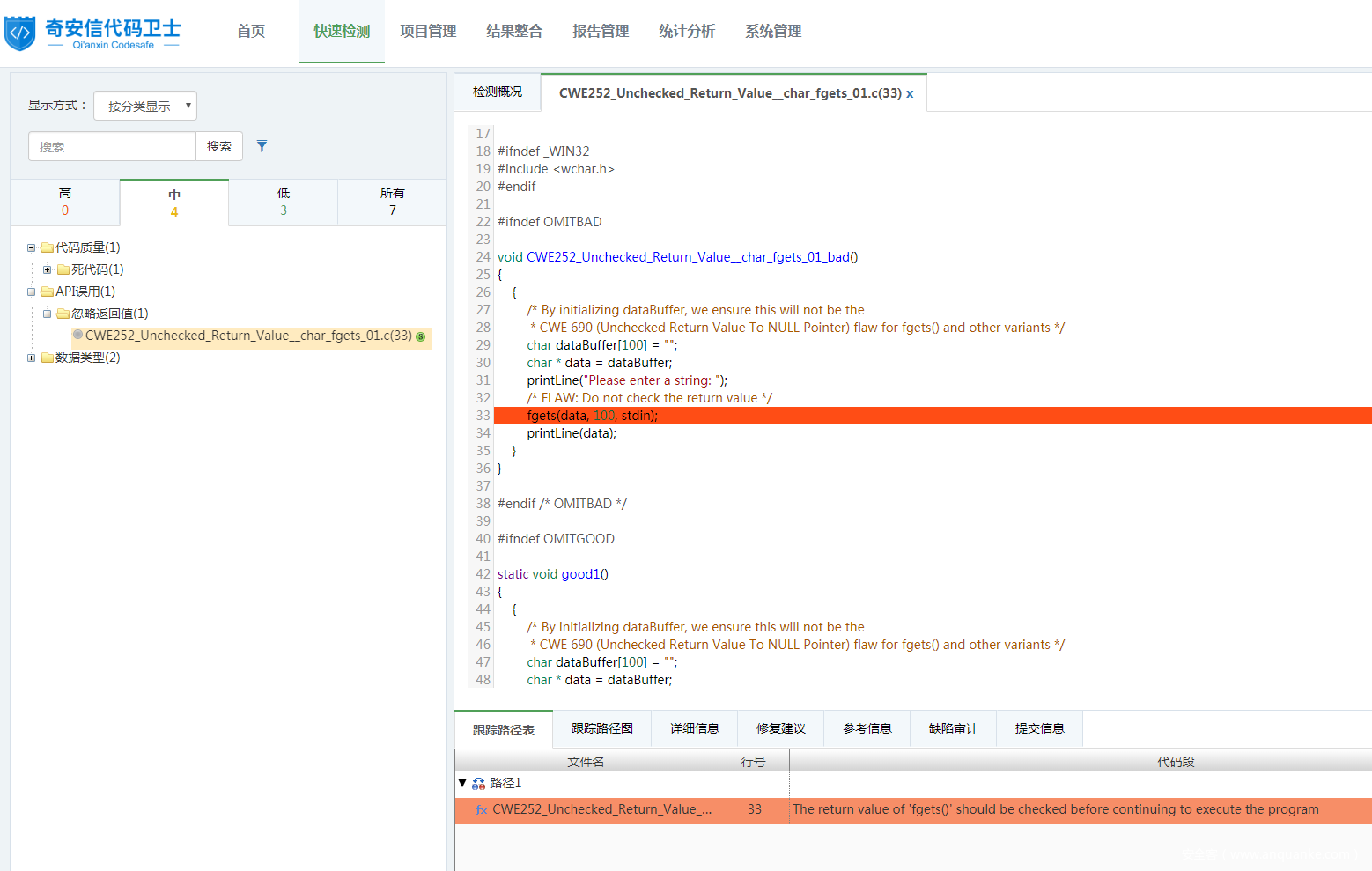 使用代码卫士对上述示例代码进行检测,可以检出“忽略返回值”缺陷,显示等级为中。如图1所示: