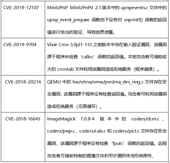 忽略函数返回值会导致未定义的行为,包括信息泄露、拒绝服务、甚至程序崩溃等。