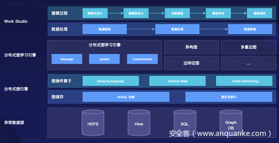 整个技术框架的核心是中间三层,分别是存储层、操作层和建模层,是极验针对图数据的特点定制化开发的。