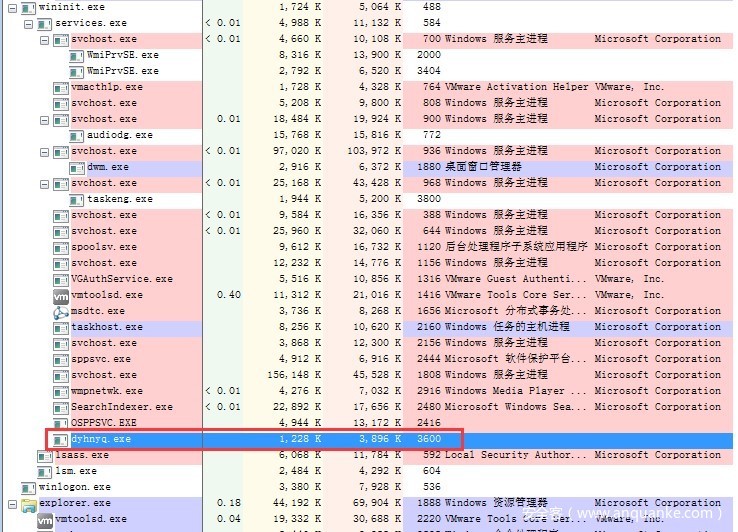 使用进程查看工具procexp排查(免安装),除了Windows核心进程、系统进程和用户进程,dyhnyq.exe进程也可疑,进一步验证,没看到有描述和数字签名,如图3-3所示。