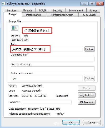 查看dyhnyq.exe进程属性,显示找不到系统指定的文件,点击Verify验证数字签名,没有通过,可确认是恶意了。