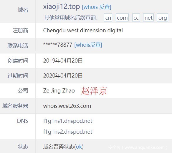 对域名xiaoji12.top whois查询,查到是在成都西部数码whois.west263.com注册的,域名年限是一年,从拼音看注册人可能是赵泽京,获取到的信息不多。