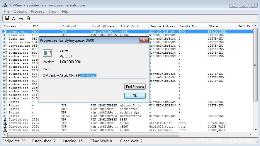 使用网络查看工具Tcpview排查(免安装),查看网络连接的Remote Address和使用的Port,看到222.187.238.16:8000外网通信,常用端口,结合进程名dyhnyq.exe,初步判定222.187.238.16可疑,查看进程属性,显示是微软的服务,路径为C:WindowsSysWOW64。