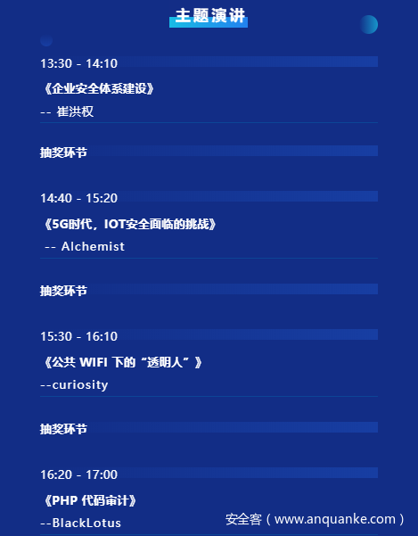 信睿安全技术沙龙由吉林省信睿网络信息安全有限公司举办。本沙龙围绕着,企业安全,物联网安全,公共wifi安全,以及代码审计等议题,共同探讨当今互联网热门技术。
