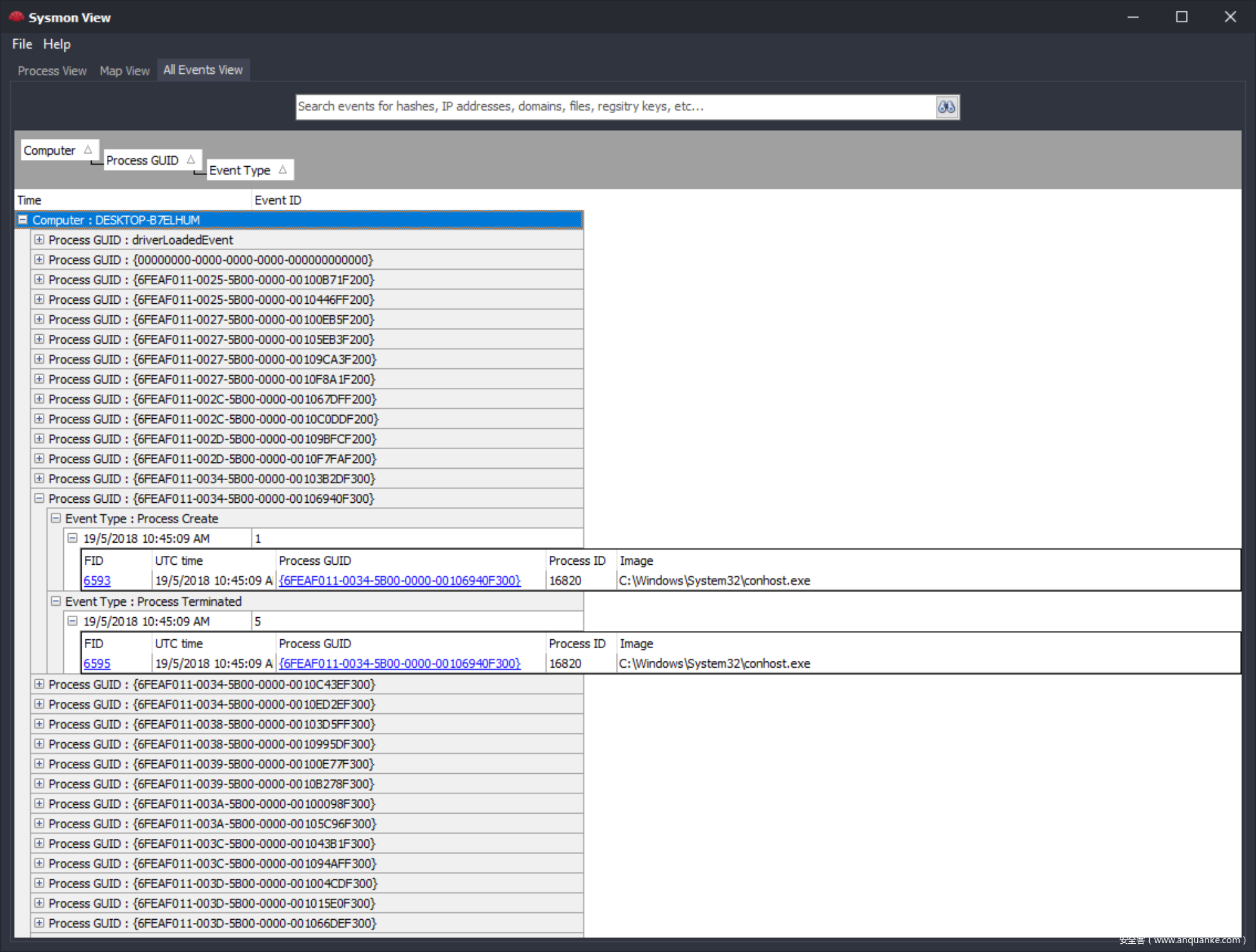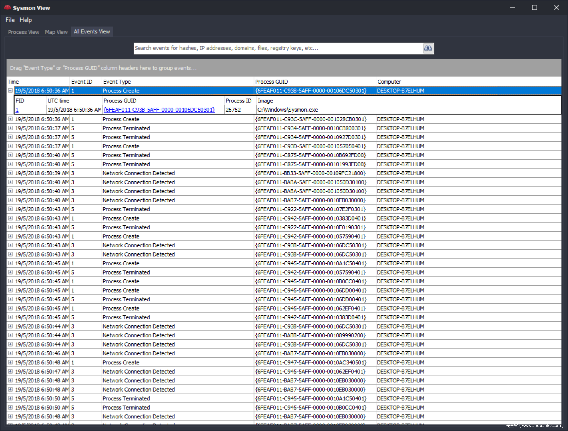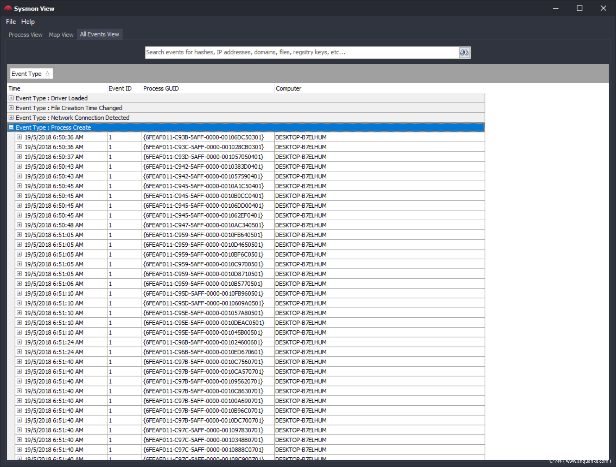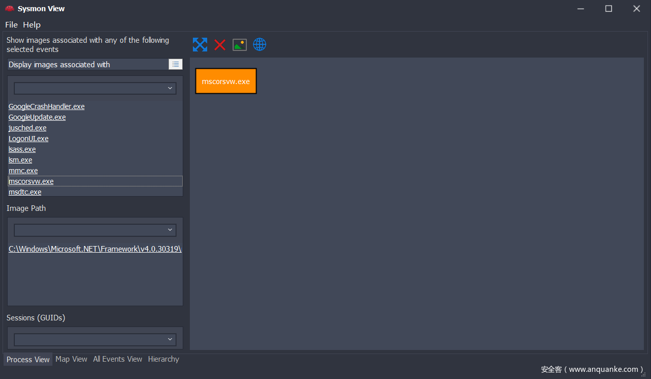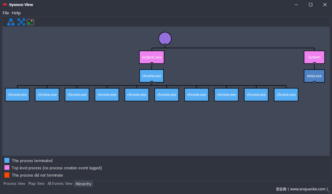 Sysmon View工具包含四个视图菜单选项:Process View、Map View、All Events View,Hierarchy、下面我们来分别介绍这四个视图的作用