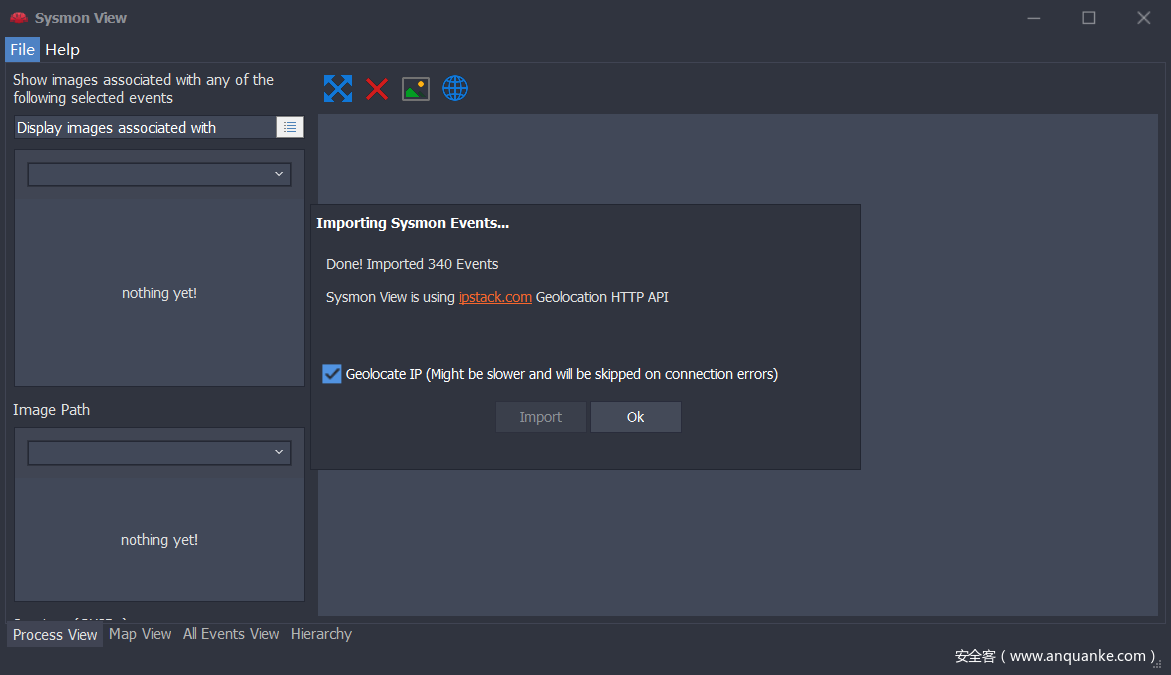 在事件导入过程中,有一个地理定位IP地址的选项,如果设置,Sysmon View将尝试使用https://ipstack.com/service 对网络目标进行地理定位,如下所示: