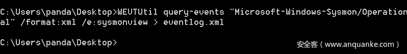 首先,使用内置的WEVTUtil工具将Sysmon事件导出到XML文件,使用命令如下所示: