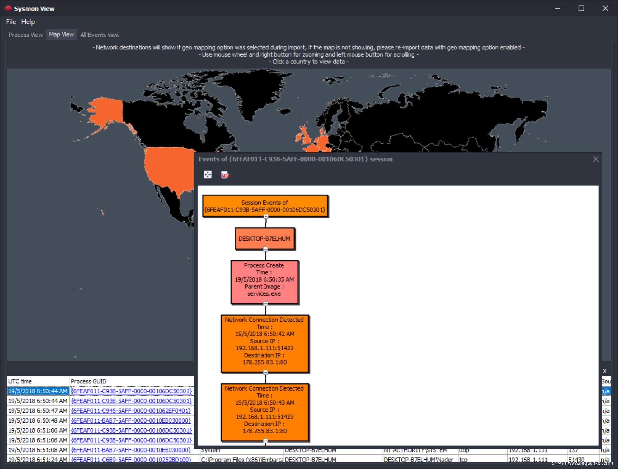 ipstack.com可对目标IP地址进行地理定位,地图视图中,通过使用网络事件作为起点,可以轻松地在相关(相关)事件之间导航,同样,该工具可以使用正在运行的进程会话GUID来实现此目的。要浏览相关事件,请使用会话GUID的超链接,类似于流程视图的新视图将显示在包含所有相关会话事件的新窗口中,如下所示: