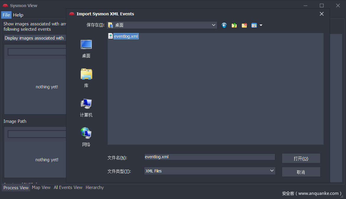 导出后,运行Sysmon View并导入生成的eventlog.xml文件