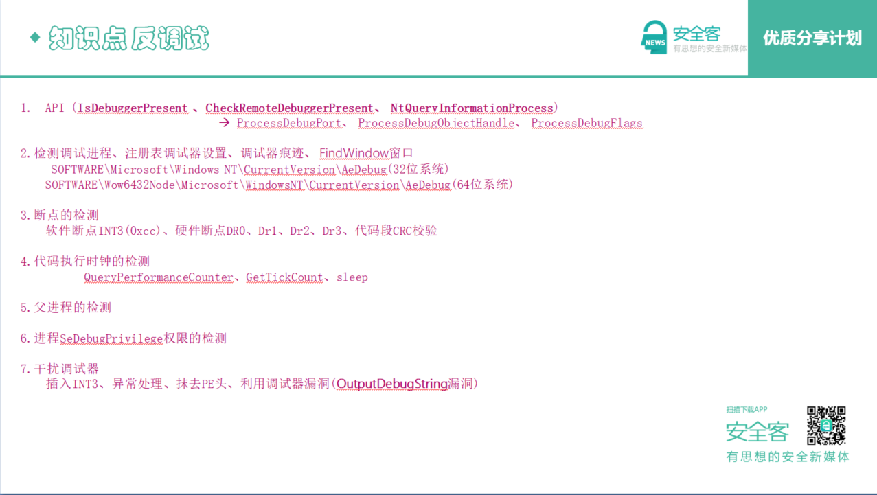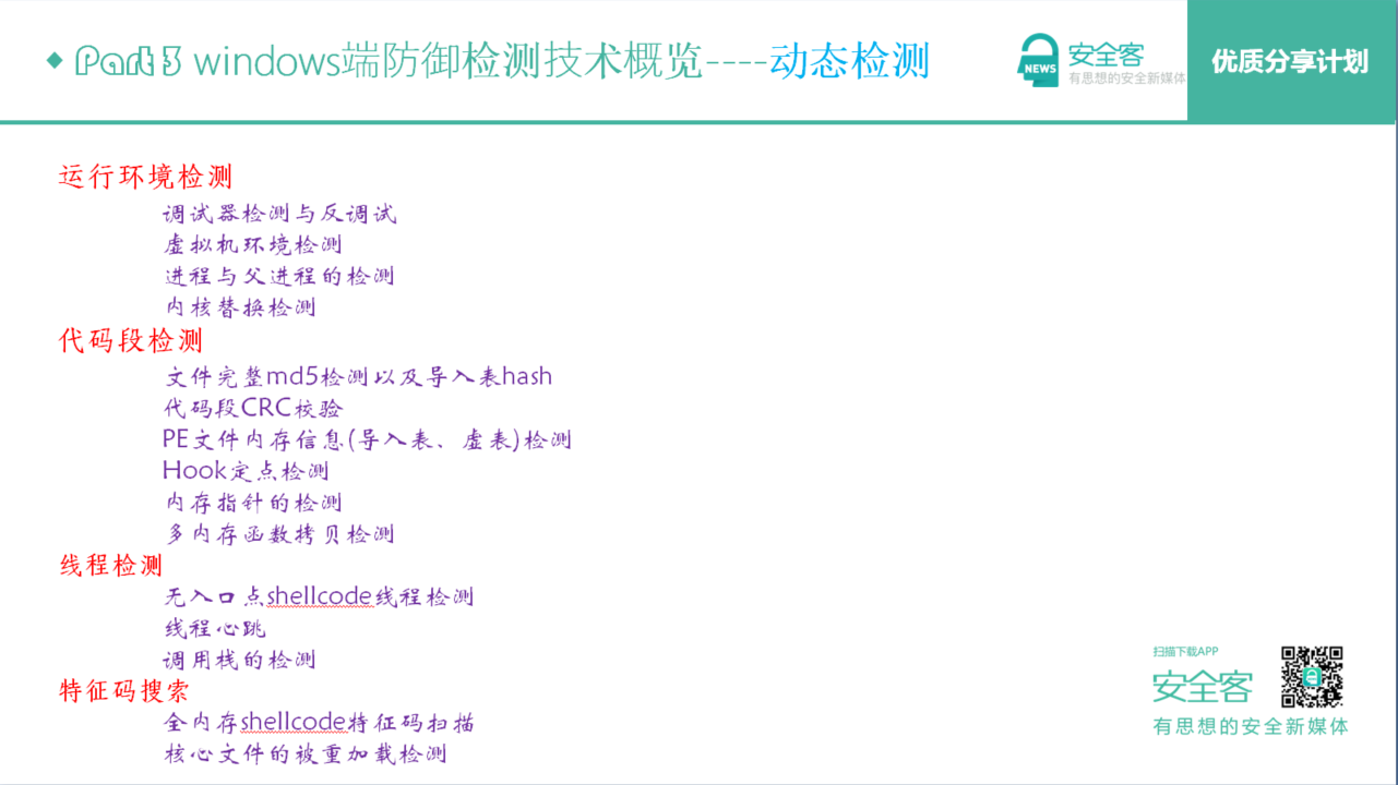 其次是动态保护技术通常使用的技术就是对运行环境的检测(调试器与反调试(见附录)、虚拟机环境、父进程、内核环境检测)、代码段检测、线程检测、特征码的检测。