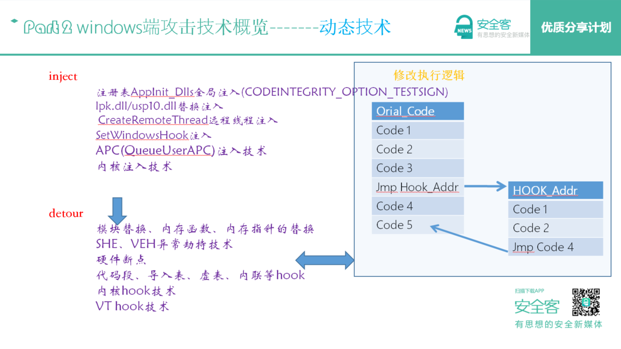 动态攻击技术顾名思义就是动态地去攻击被攻击的程序或者系统,动态的攻击主要就是把自己加载到第三方的进程里,通常这样的技术叫做注入技术,通过注入技术后把恶意文件或者代码加载到被攻击进程,然后去修改相应的代码执行流程去达到欺骗等恶意的目的,这类技术在端技术里通常叫做detour技术。Detour技术不只是通过修改代码去实现,也可以通过修改数据去实现比如c++中的虚表数据,或者new分配的class指针都可以达到相应的目的。